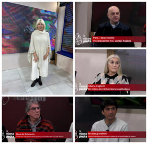 En «La Misma Piedra», miércoles 29 de mayo, de 20 a 21 hrs, por Televisión Regional (canal 19 analógico ó 6 digital de Cablevisión), nos visitan el Pbro. Fabián Monte (Vicepresidente 1ro. Cáritas Rosario); Lic. Silvina Vaghetti (Directora de Cáritas Parroquia María Auxiliadora); Nicolás Gianelloni (Secretario de Desarrollo Humano y Hábitat de la Municipalidad de Rosario) y Eduardo Delmonte (Coordinador trabajadores desocupados y precarizados de la CCC Gran Rosario)